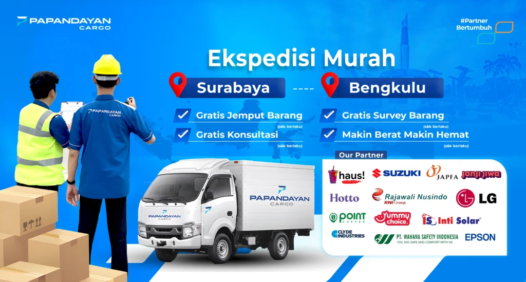 Ekspedisi Surabaya Bengkulu – Papandayan cargo merupakan perusahaan yang bergerak di bidang jasa pengiriman barang di Surabaya yang melayani pengiriman berbagai jenis barang diantaranya barang Kosmetik, Garment, konveksi, sparepart, telekomunikasi, pertambangan, pertanian dan berbagai barang General Cargo lainnya dari Surabaya ke Bengkulu. Selain itu, kami juga melayani jasa pengiriman motor Surabaya Bengkulu dan juga jasa pindahan rumah dari Surabaya ke Bengkulu.