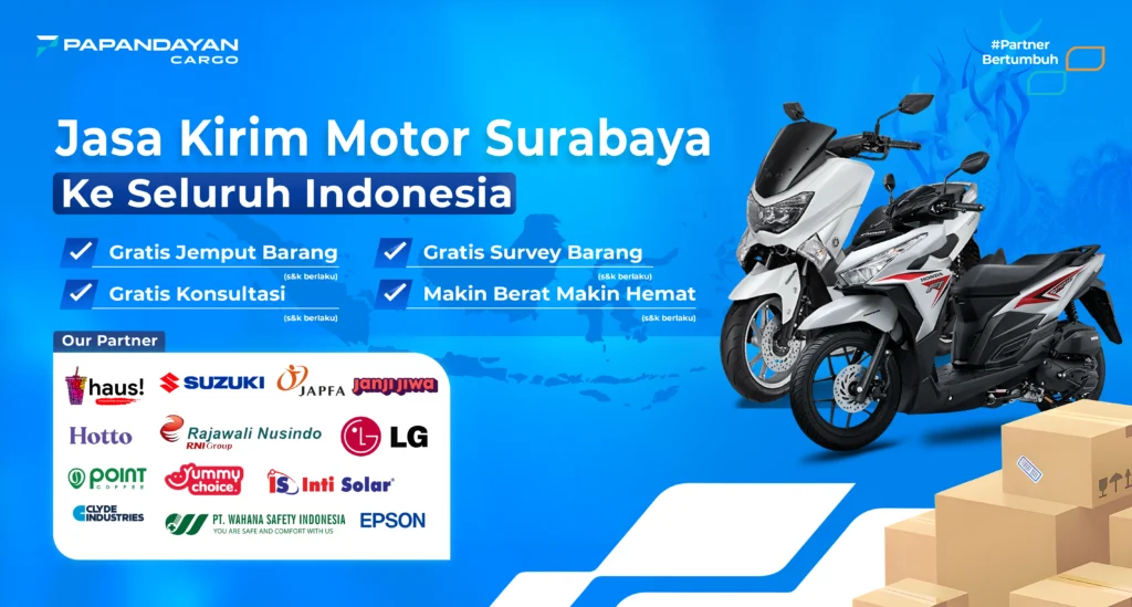 Jasa Pengiriman Motor Surabaya ke Seluruh Indonesia – Papandayan Cargo melayani pengiriman motor dari Surabaya ke seluruh Indonesia dengan tarif terjangkau dan jaminan barang sampai tujuan. Papandayan Cargo telah berpengalaman serta memiliki jaringan yang sangat luas yang tersebar di seluruh pulau di Indonesia sehingga memudahkan anda dalam melakukan pengiriman motor dari Surabaya ke seluruh Indonesia via darat dan Laut. Kami meberikan pelayanan door to door service, anda tidak perlu lagi mengantar barang ke counter kami melainkan kami akan menjemput barang tersebut ke tempat anda dan mengantarkan ke tempat tujuan.